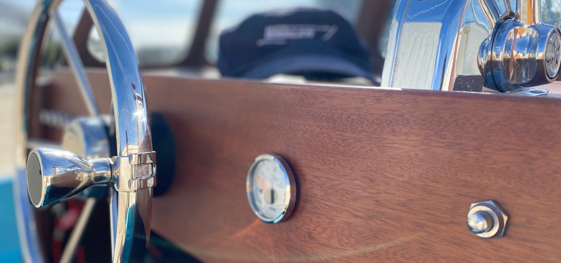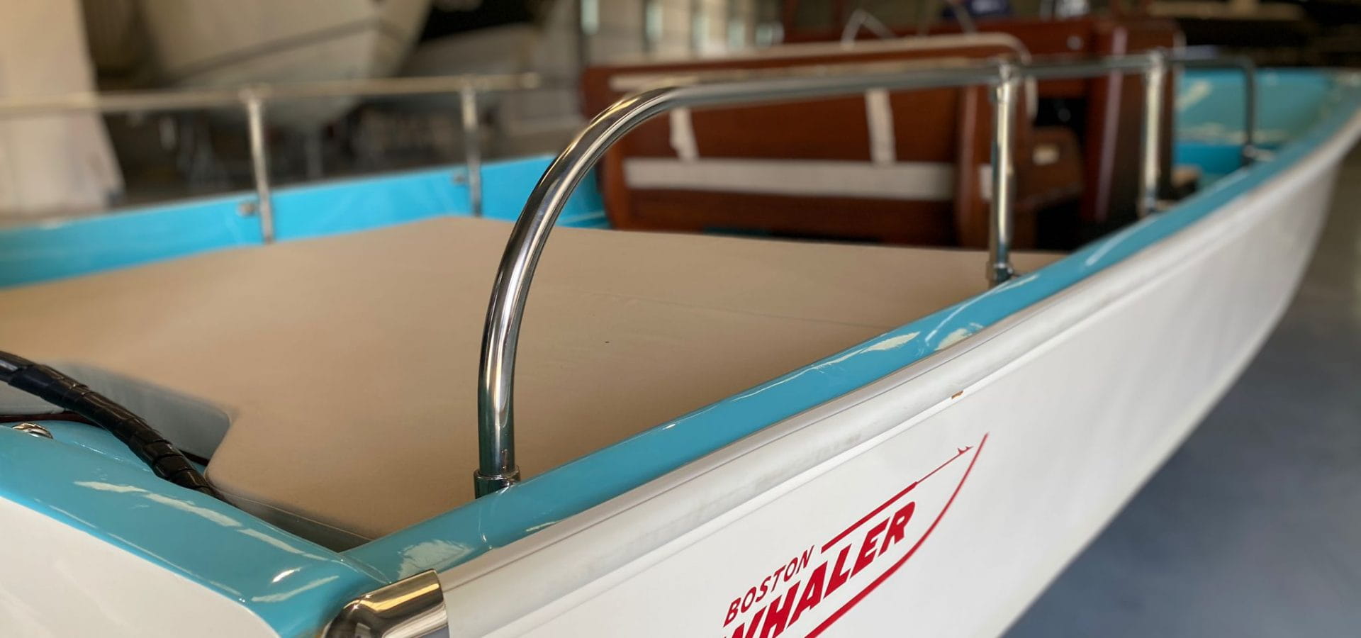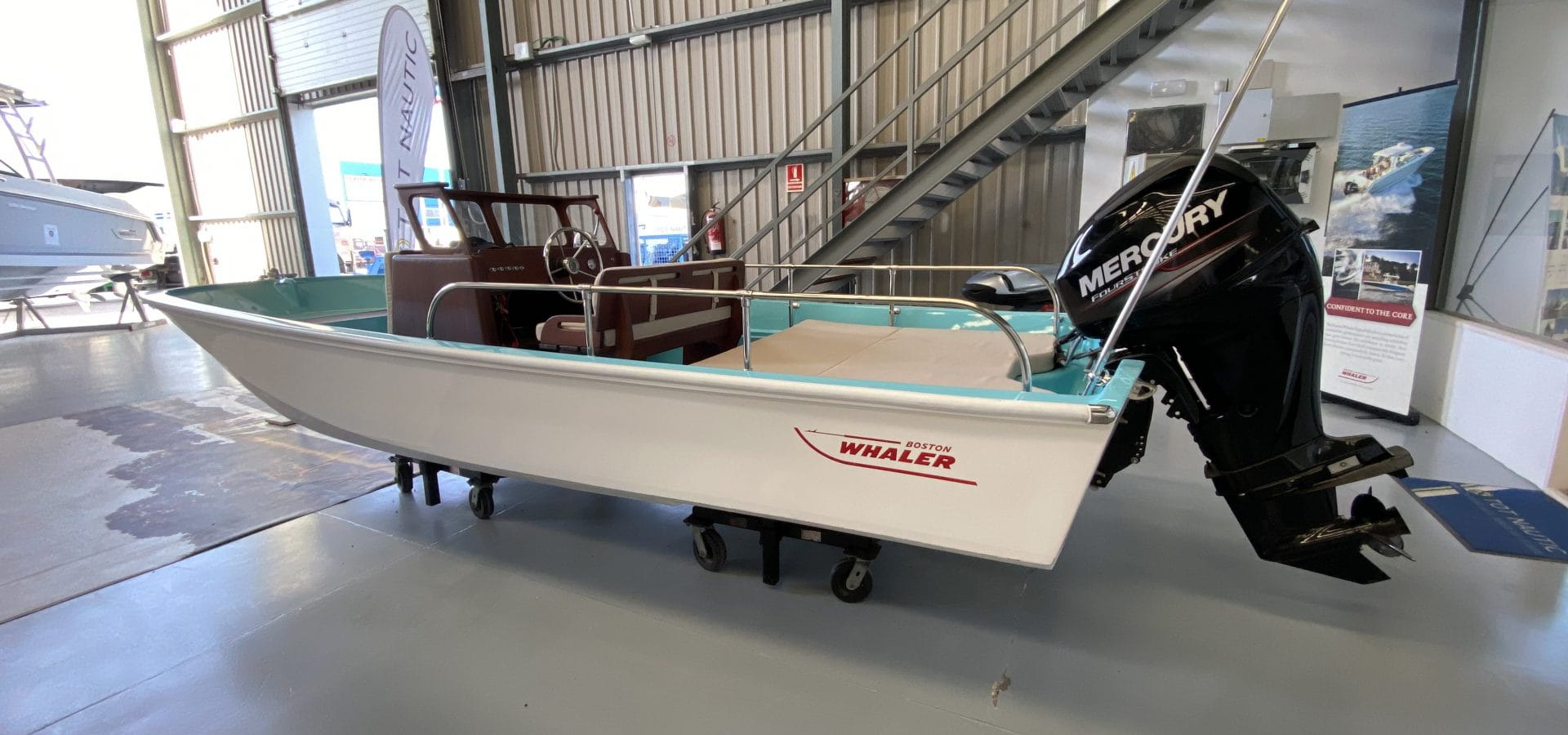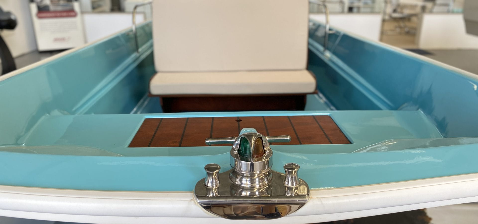 One of the earliest models available in the 16-foot hull, the Nauset (pronounced “NAW-sit”) featured an elaborate mahogany center console. The 1970 Whaler catalog described it this way: