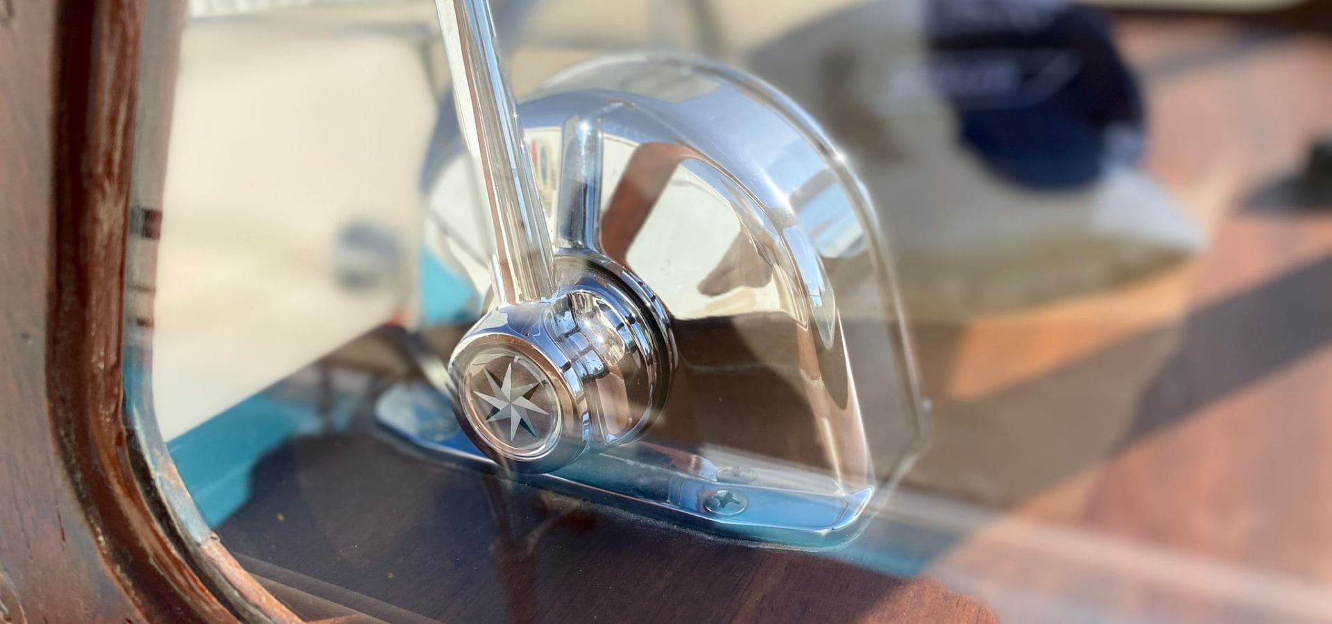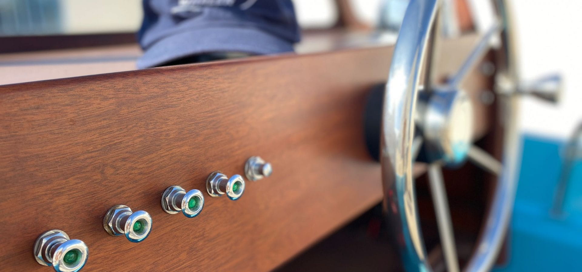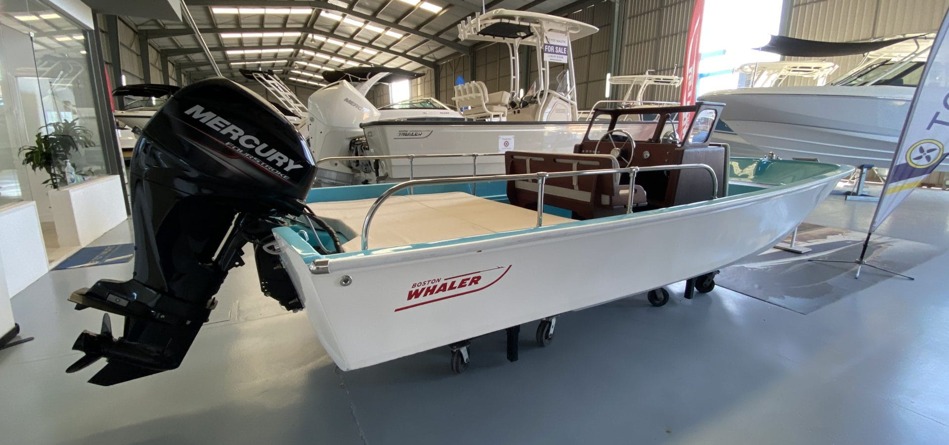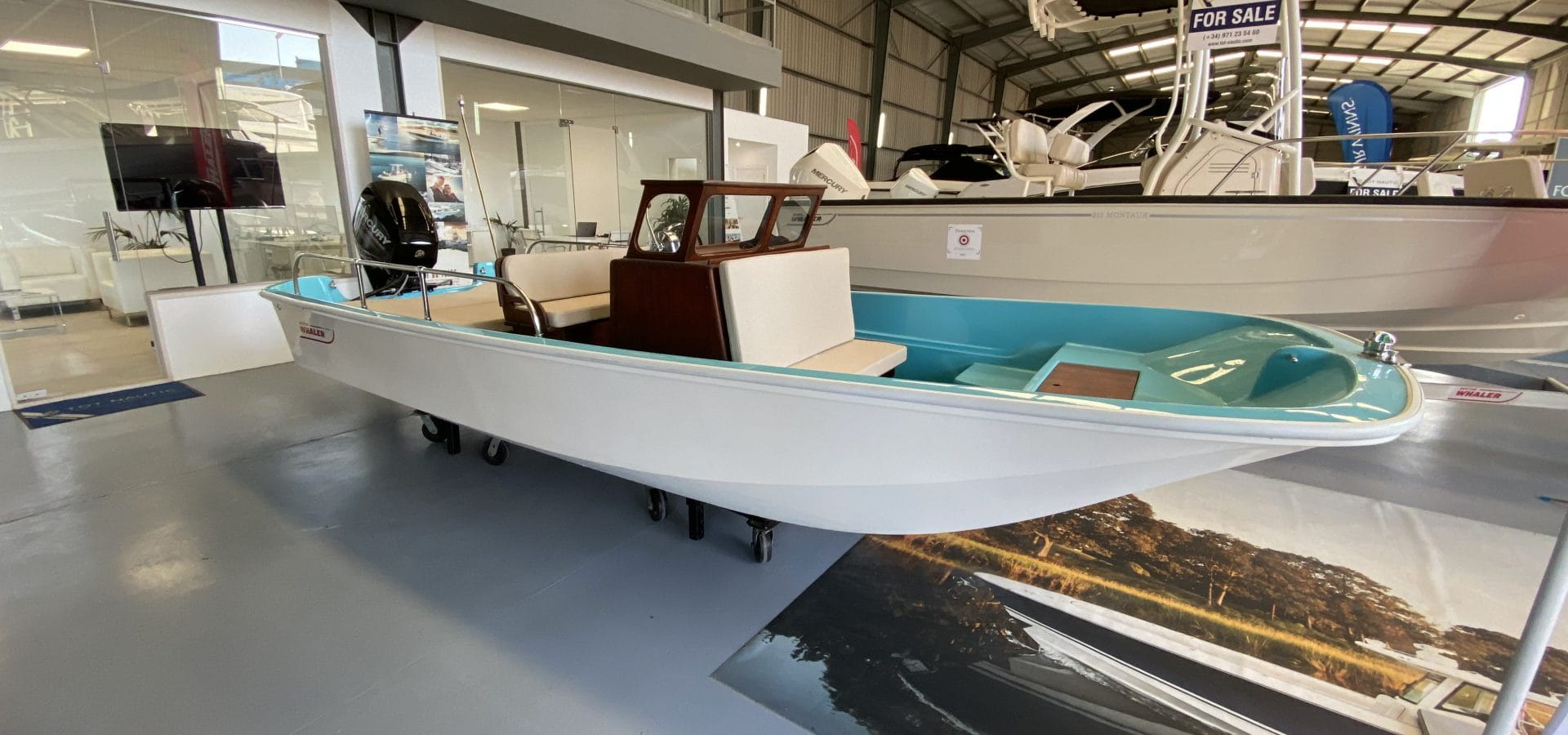 One of the earliest models available in the 16-foot hull, the Nauset (pronounced “NAW-sit”) featured an elaborate mahogany center console. The 1970 Whaler catalog described it this way: