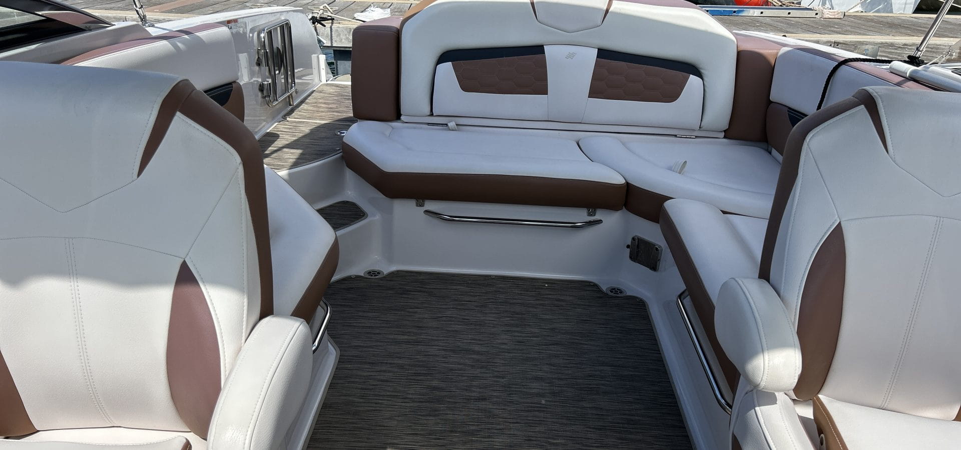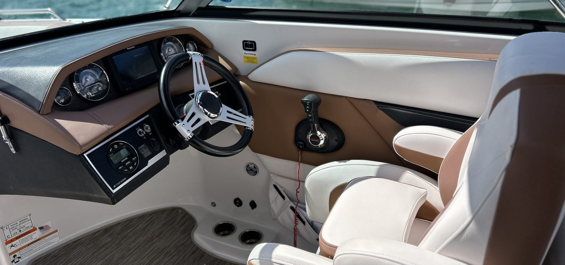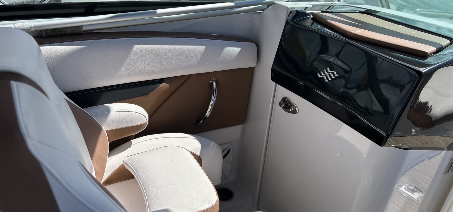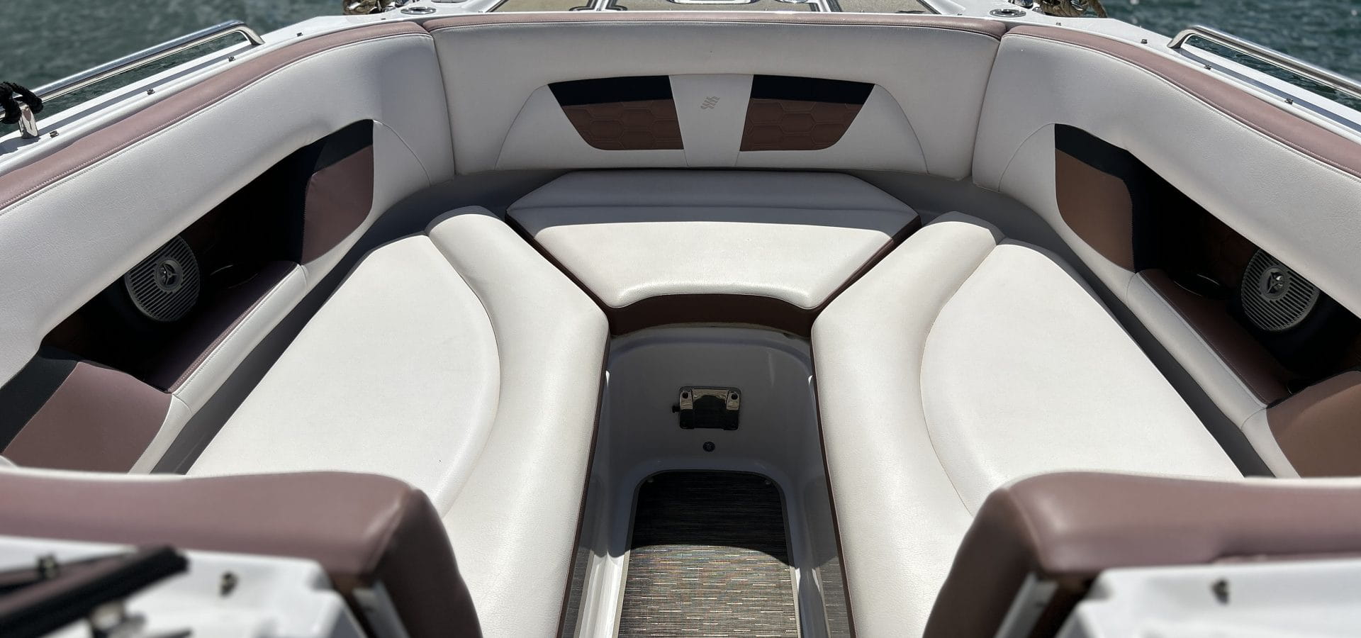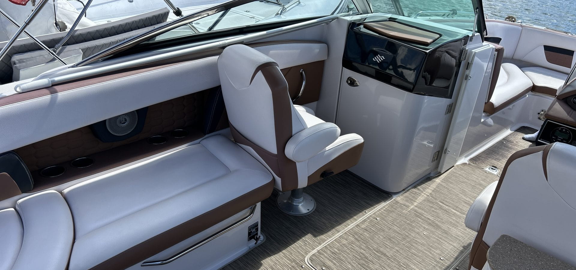 The Four Winns HD 270 boasts a spacious open-bow layout with generous seating options, including a nearly square bow area that allows guests to relax and stretch out in comfort. In the cockpit, both the captain and companion benefit from swivel and reclining bucket seats, while a convenient walk-through to the transom ensures easy access to the water. The helm station features a sleek, upholstered design with intuitive controls and excellent visibility for confident navigation.