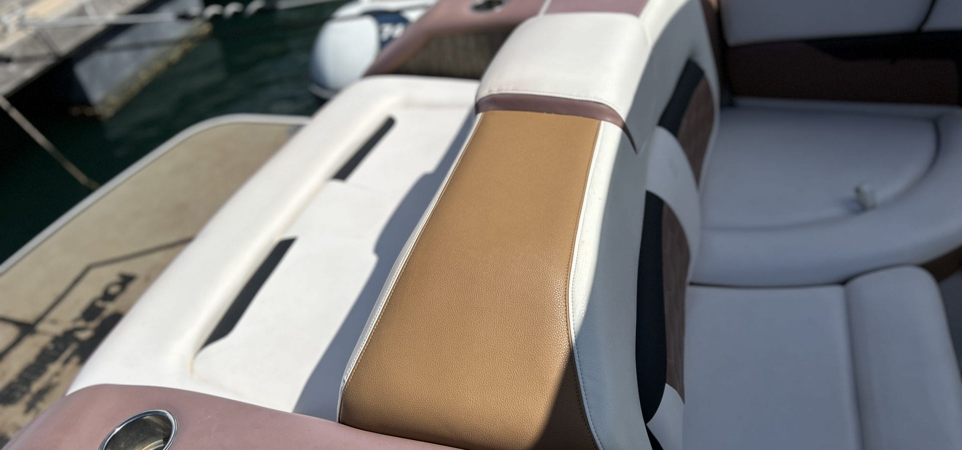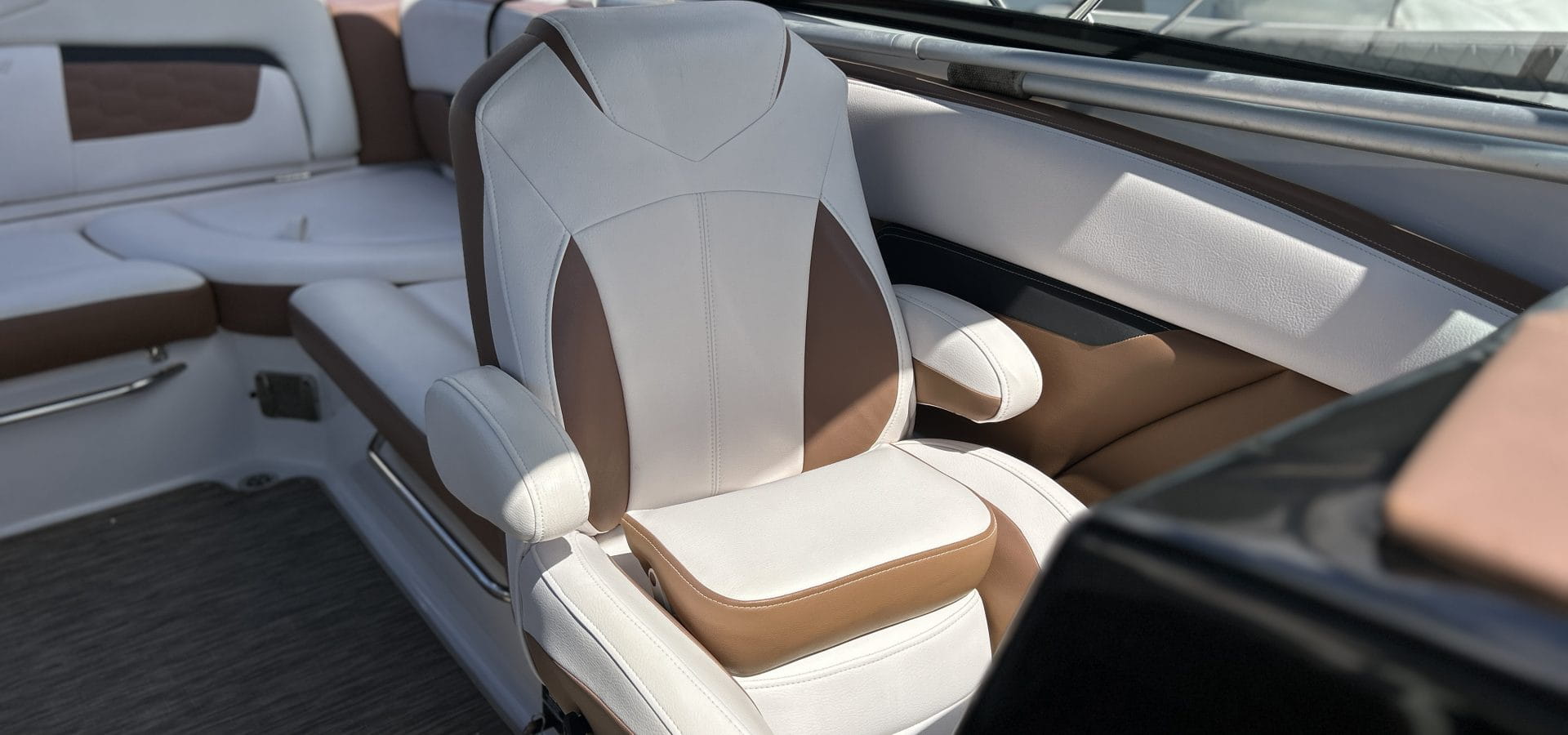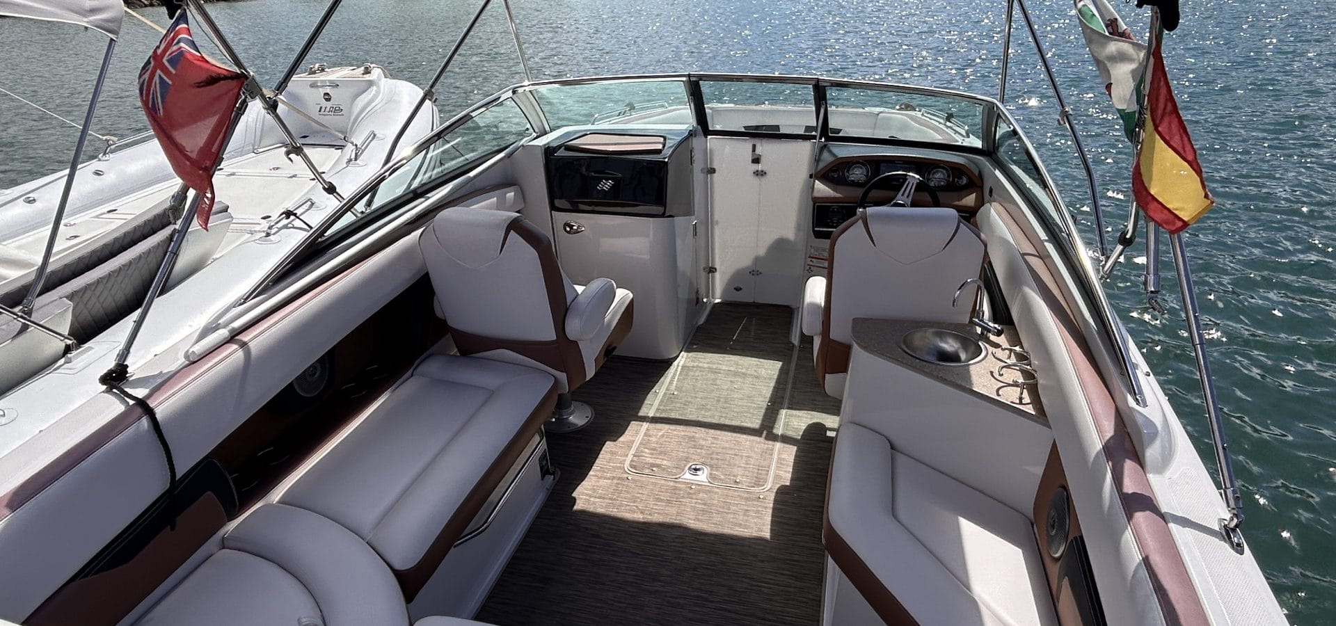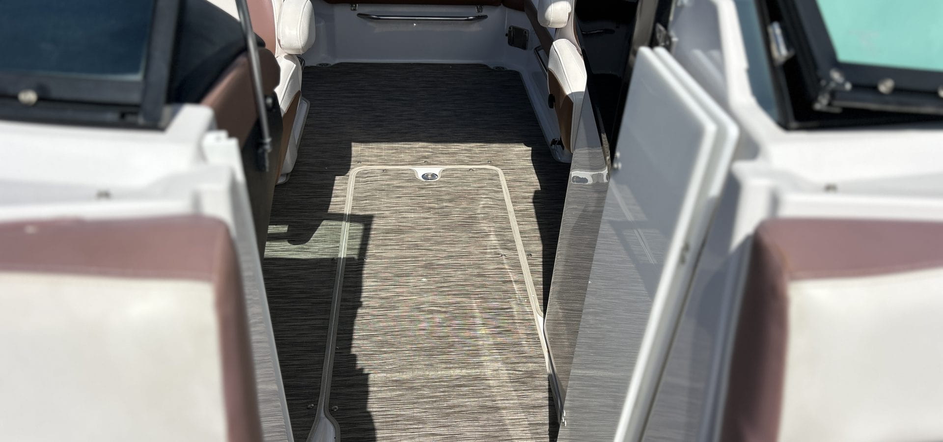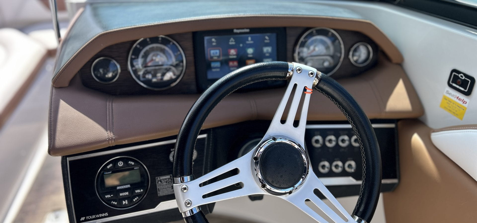 The Four Winns HD 270 boasts a spacious open-bow layout with generous seating options, including a nearly square bow area that allows guests to relax and stretch out in comfort. In the cockpit, both the captain and companion benefit from swivel and reclining bucket seats, while a convenient walk-through to the transom ensures easy access to the water. The helm station features a sleek, upholstered design with intuitive controls and excellent visibility for confident navigation.