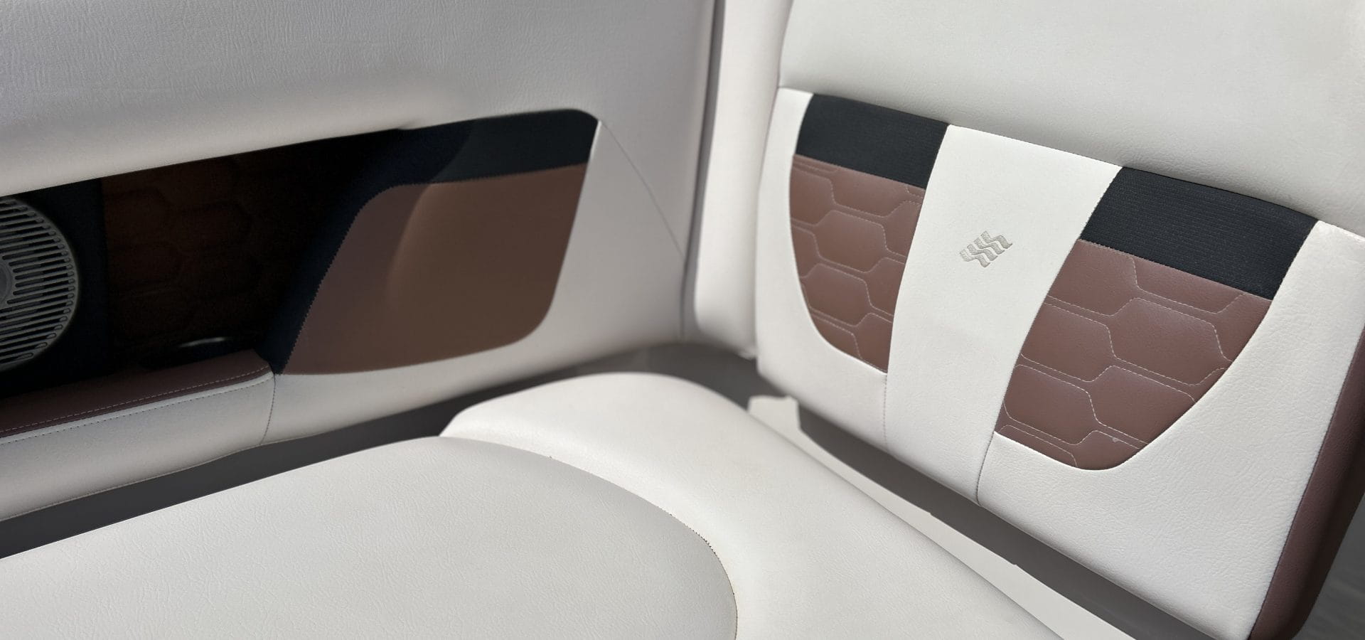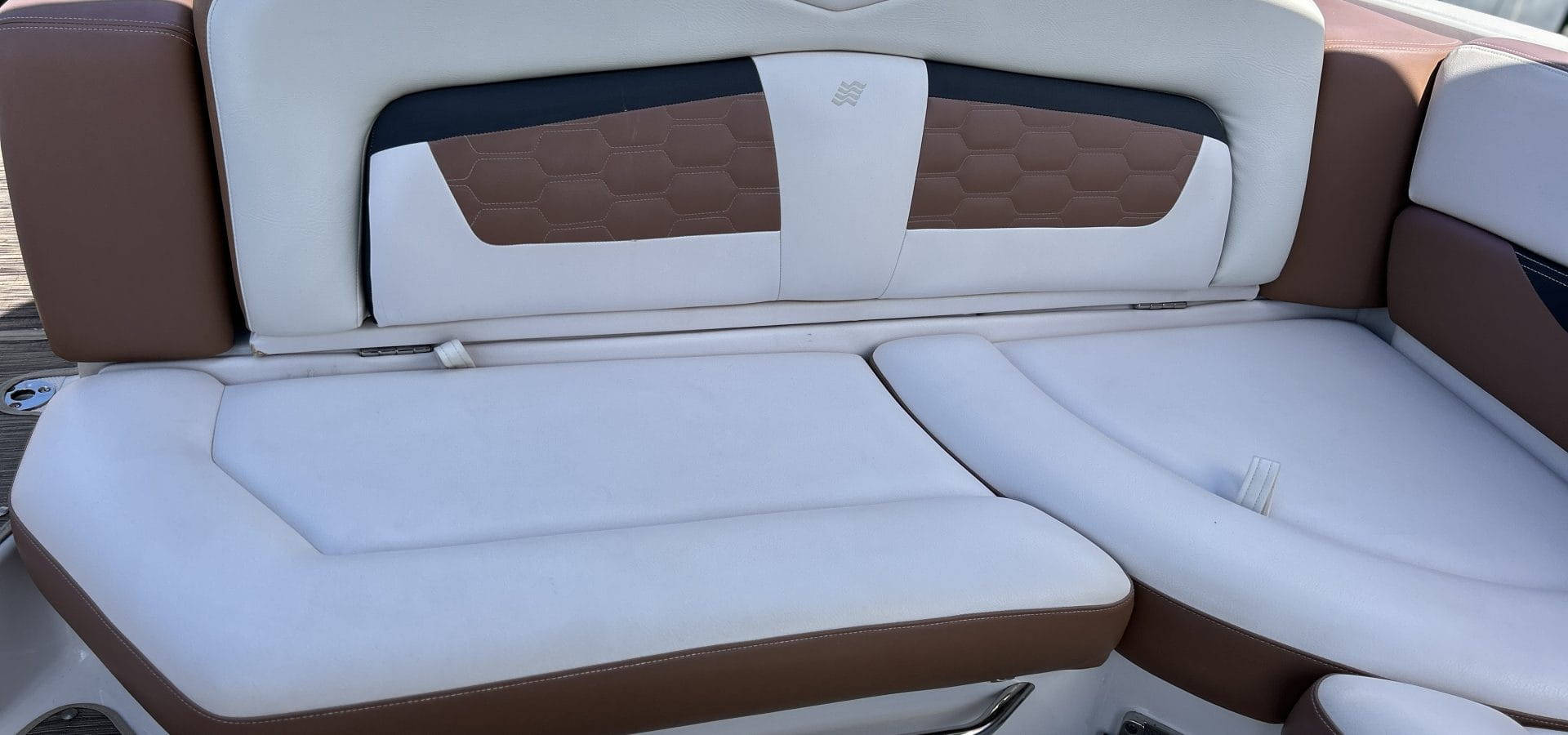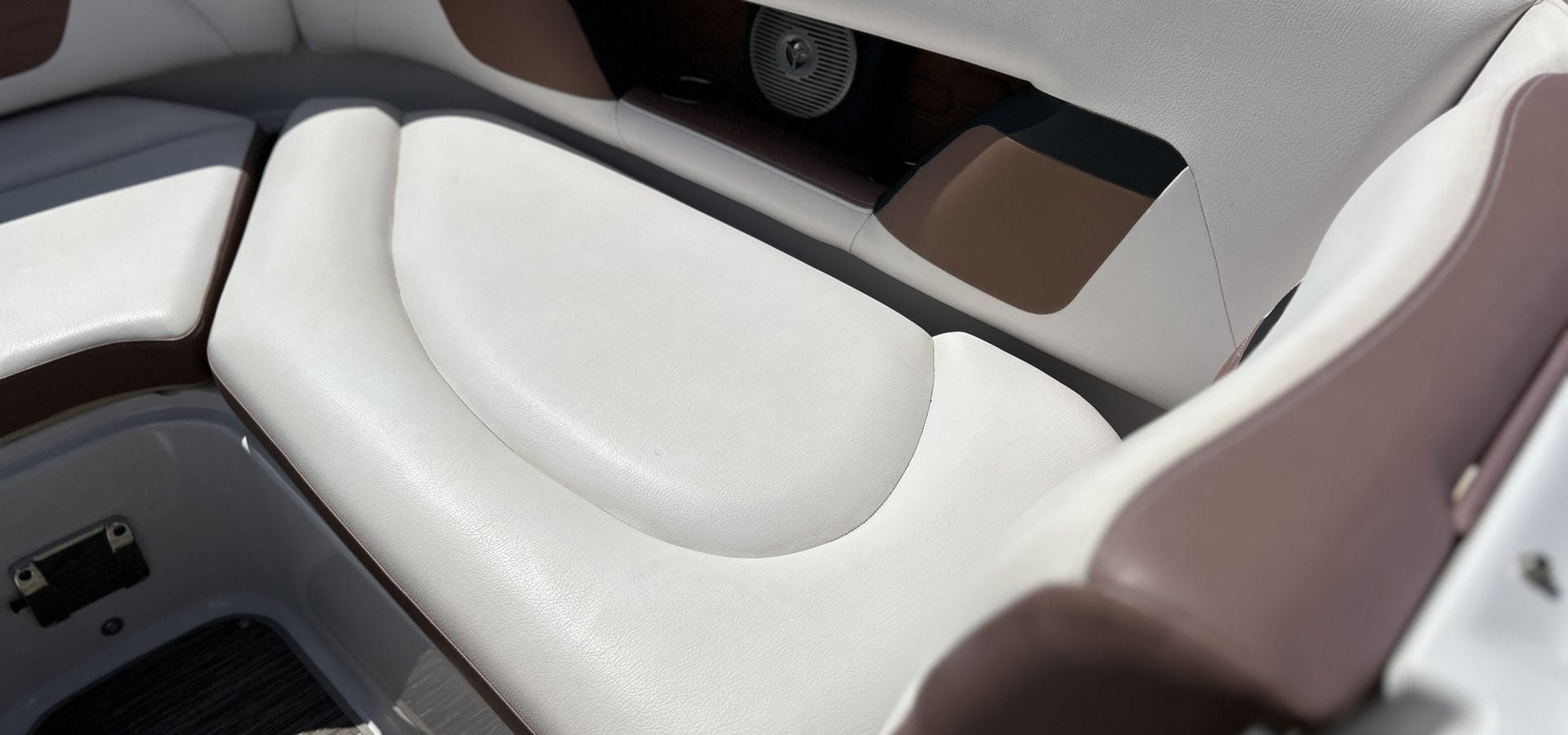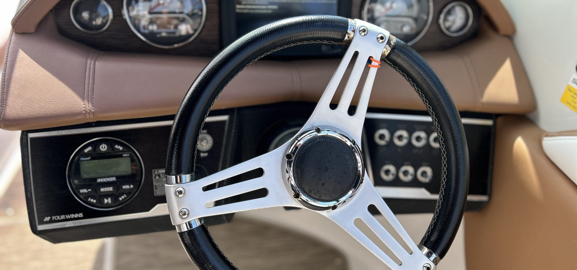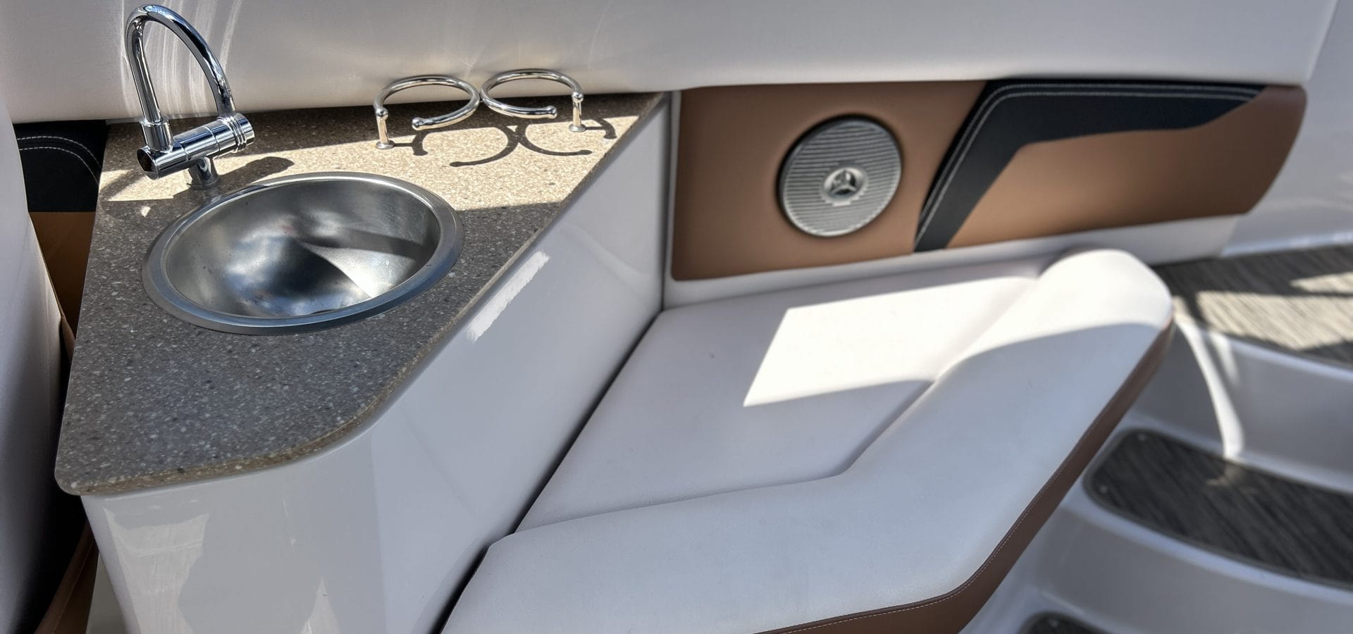 The Four Winns HD 270 boasts a spacious open-bow layout with generous seating options, including a nearly square bow area that allows guests to relax and stretch out in comfort. In the cockpit, both the captain and companion benefit from swivel and reclining bucket seats, while a convenient walk-through to the transom ensures easy access to the water. The helm station features a sleek, upholstered design with intuitive controls and excellent visibility for confident navigation.
