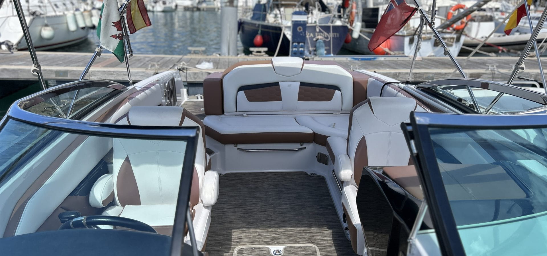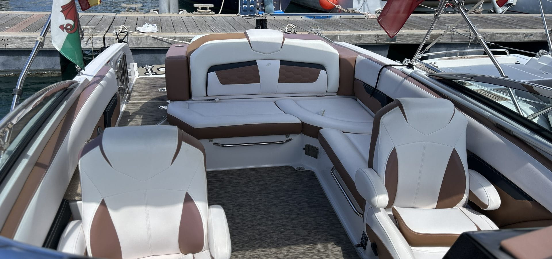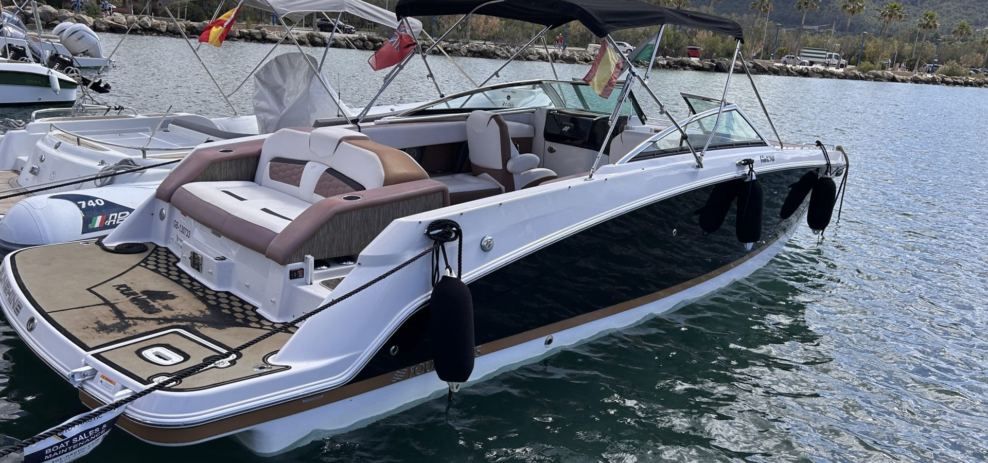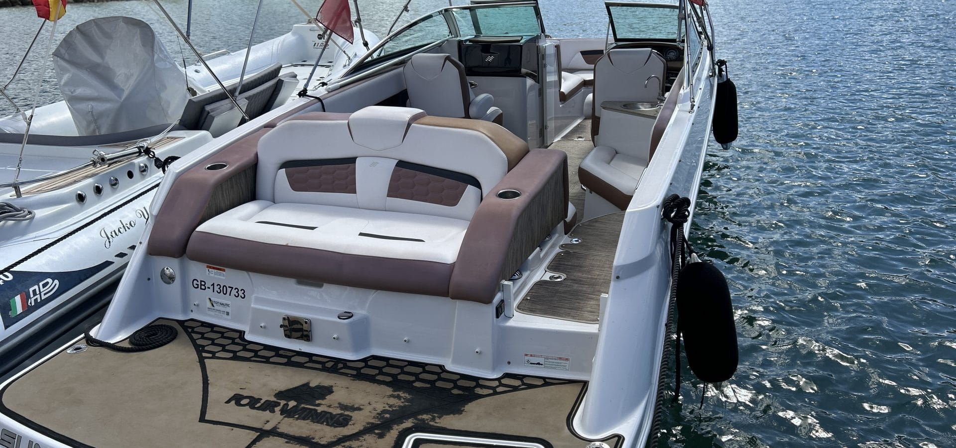 This model is equipped with a Bimini top for sun protection, high-quality sound systems for an immersive audio experience, GPS plotter with depth sounder for confident navigation, accent lighting for evening ambiance, and integrated swim platforms that invite effortless enjoyment of the water.