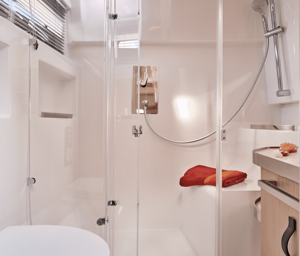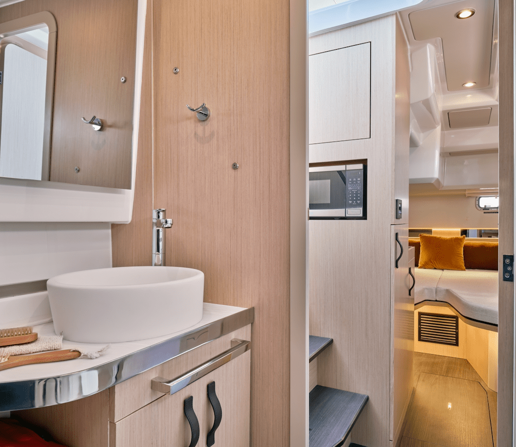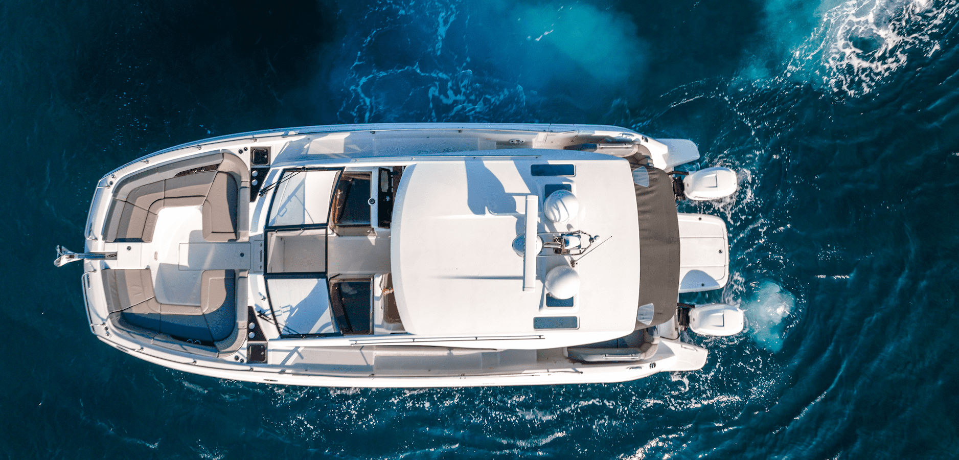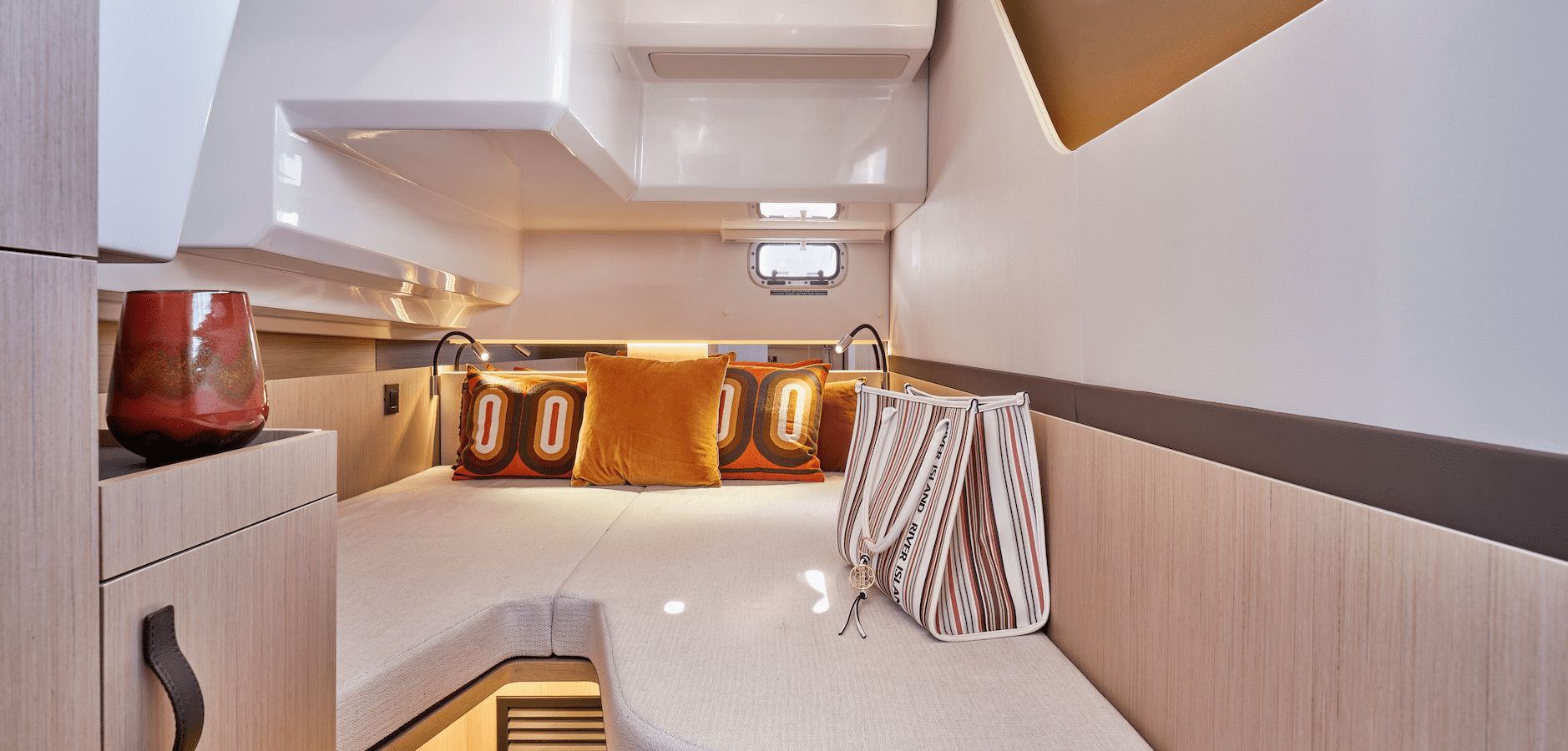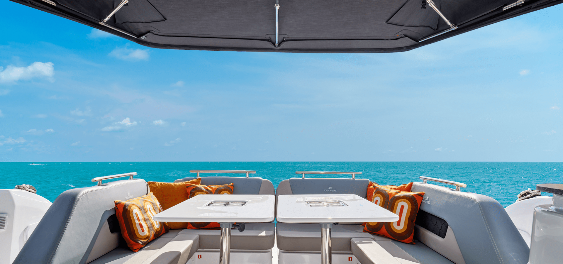 The versatile aft cockpit provides plush seating and adjustable tables, offering three layouts to create memorable moments on the water with family and friends.