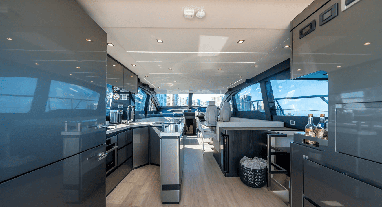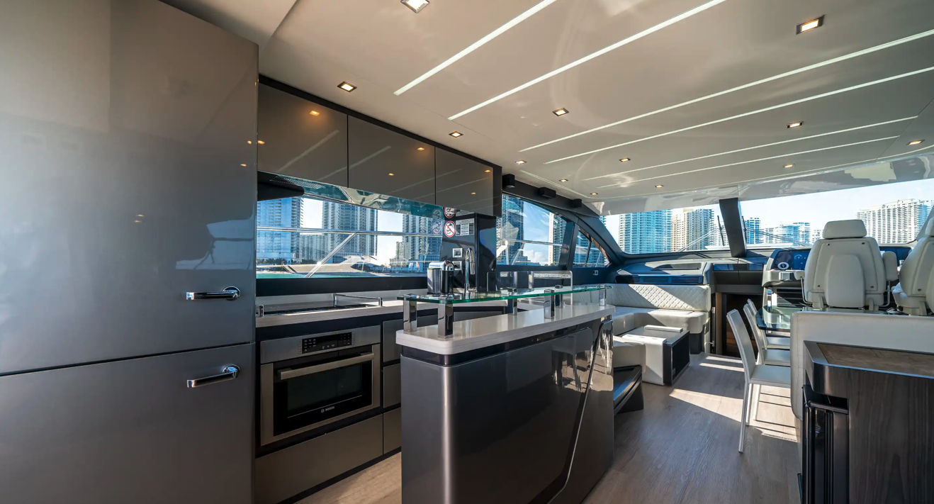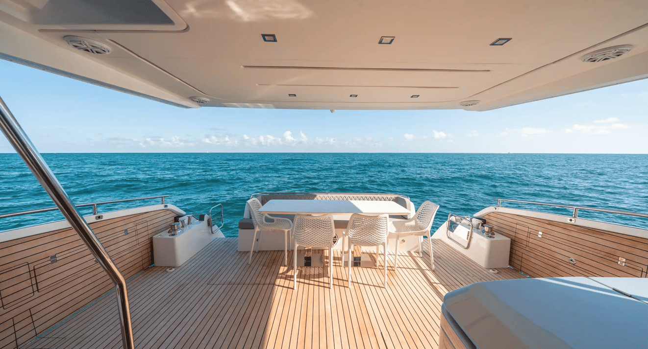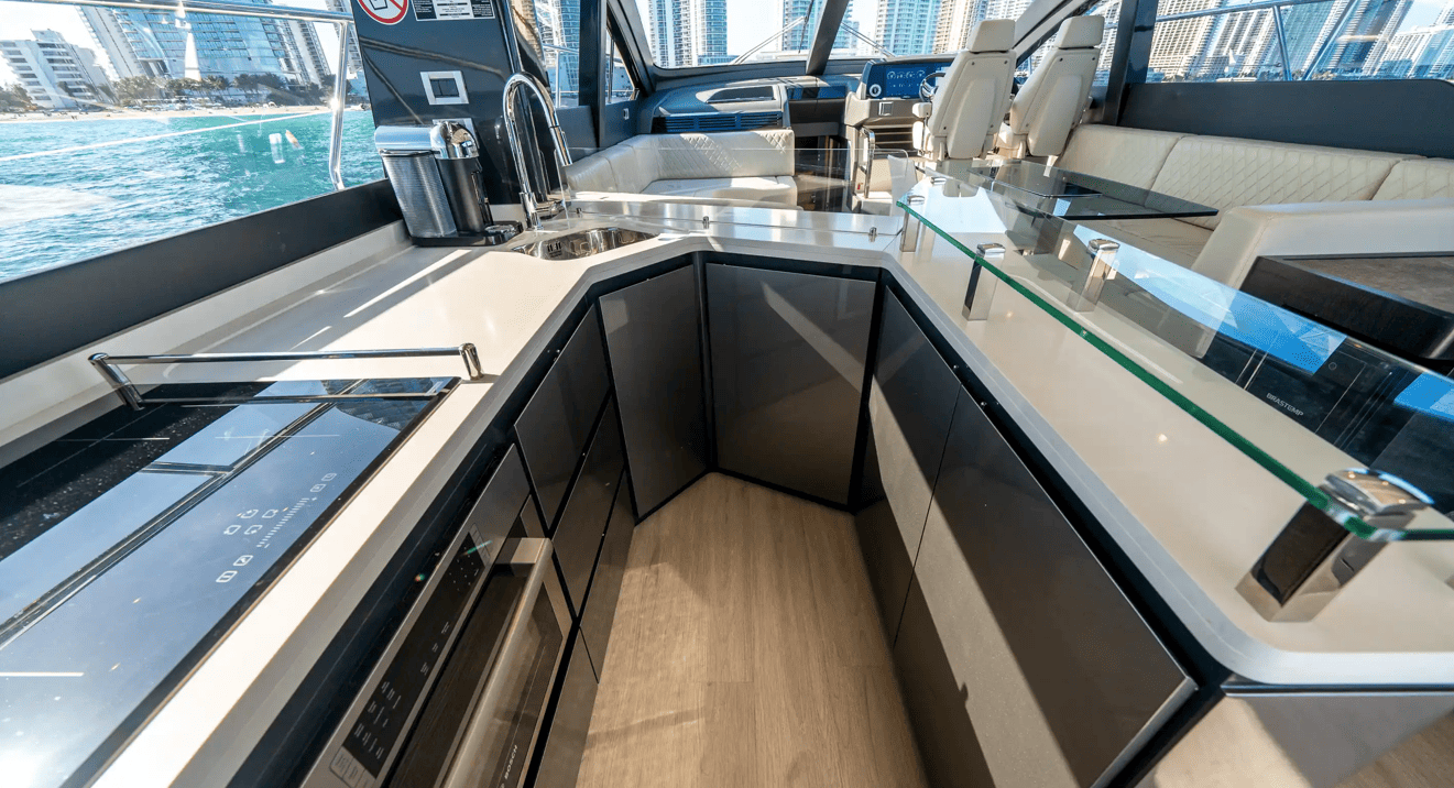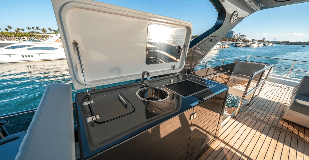 The aft platform, with an impressive lift capacity of 1,700 pounds (771kg), effortlessly accommodates tenders and lowers into the water, creating a serene space for sunset cocktails. The thoughtfully designed aft-summer kitchen features a pull-out grill, ideal for hosting. The spacious cockpit, unmatched in its class, offers generous seating, shaded areas, and integrated lighting, making it perfect for alfresco dining and entertaining.