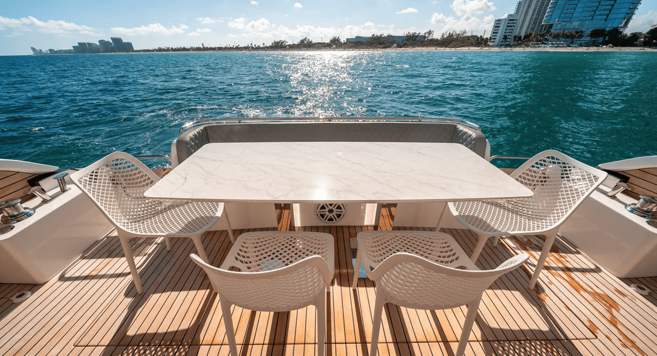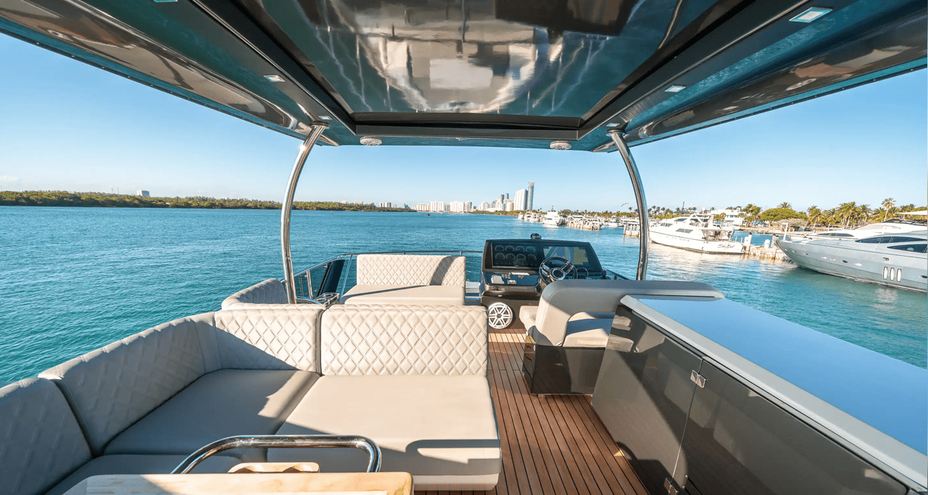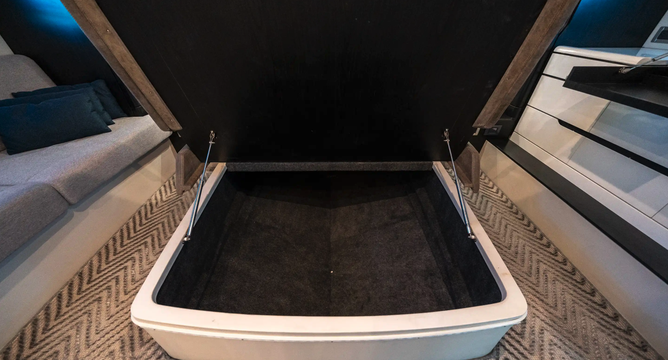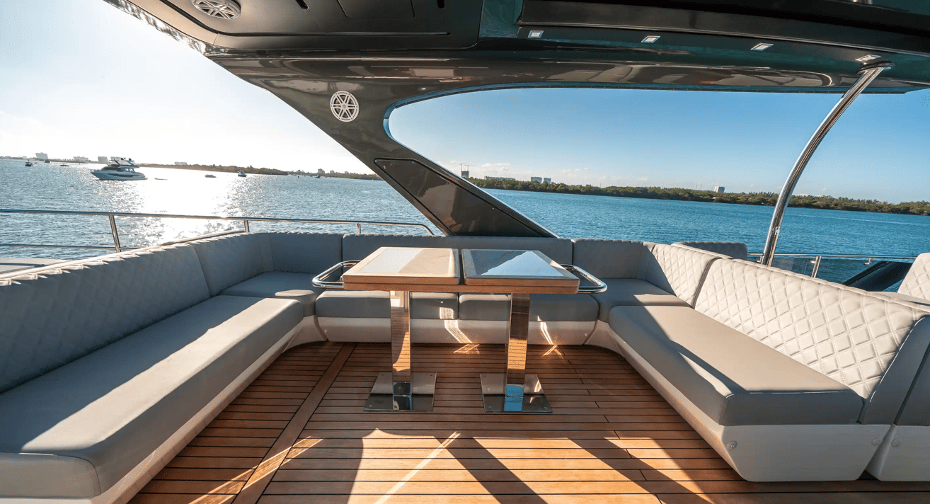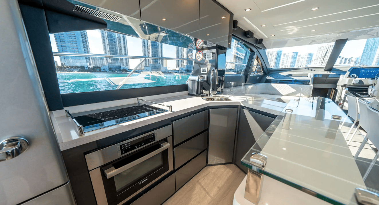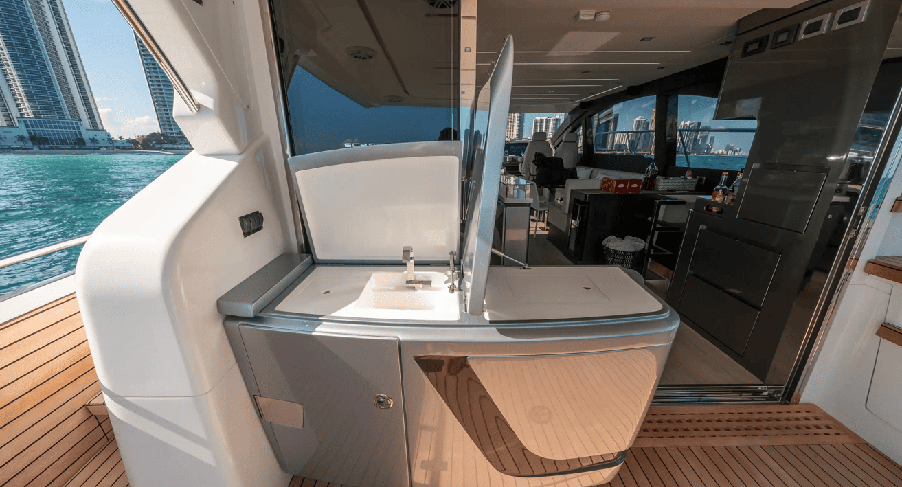 The aft platform, with an impressive lift capacity of 1,700 pounds (771kg), effortlessly accommodates tenders and lowers into the water, creating a serene space for sunset cocktails. The thoughtfully designed aft-summer kitchen features a pull-out grill, ideal for hosting. The spacious cockpit, unmatched in its class, offers generous seating, shaded areas, and integrated lighting, making it perfect for alfresco dining and entertaining.