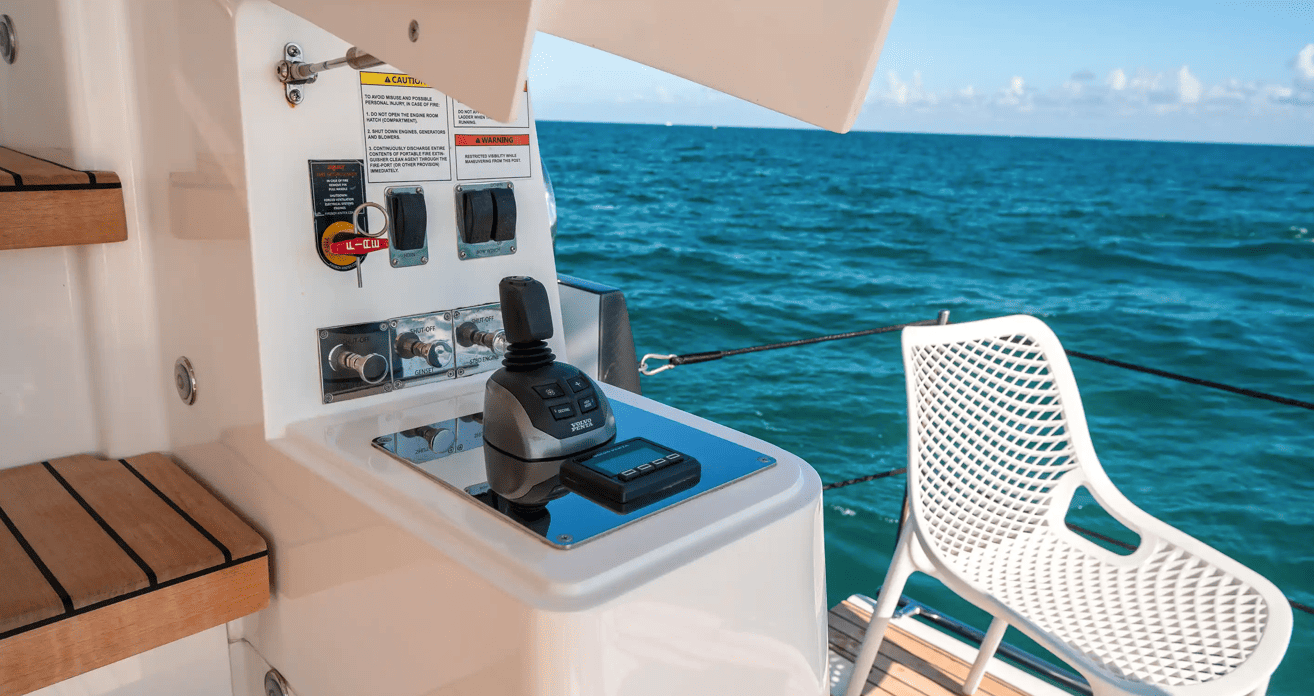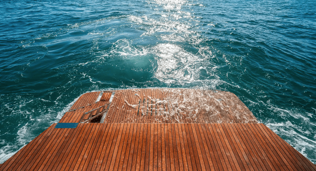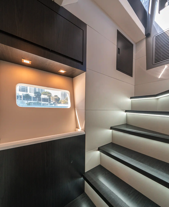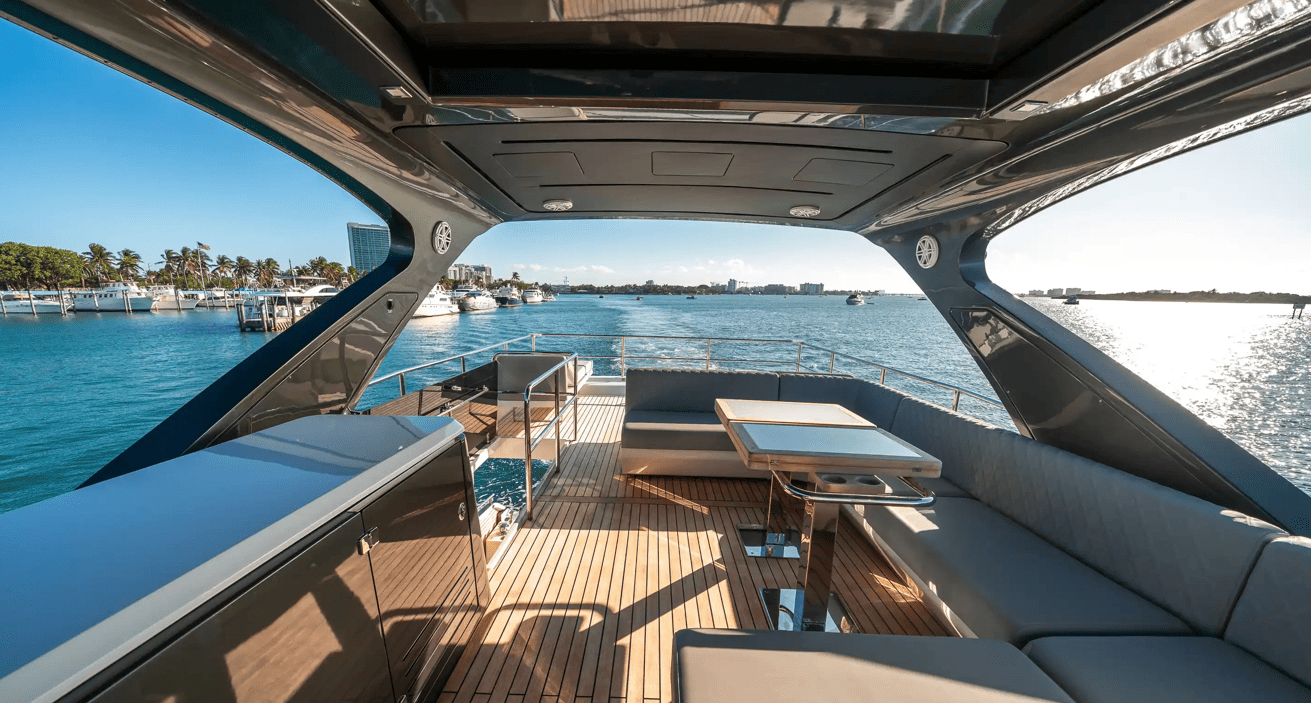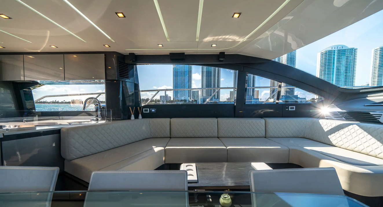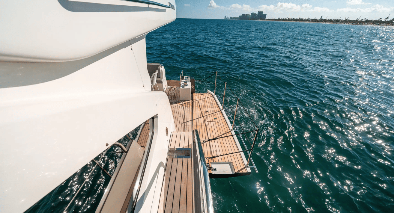 The aft platform, with an impressive lift capacity of 1,700 pounds (771kg), effortlessly accommodates tenders and lowers into the water, creating a serene space for sunset cocktails. The thoughtfully designed aft-summer kitchen features a pull-out grill, ideal for hosting. The spacious cockpit, unmatched in its class, offers generous seating, shaded areas, and integrated lighting, making it perfect for alfresco dining and entertaining.