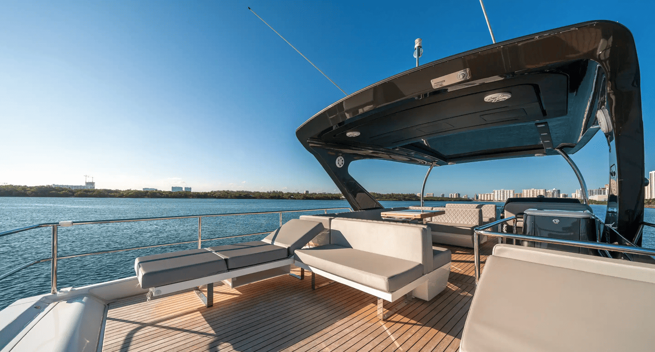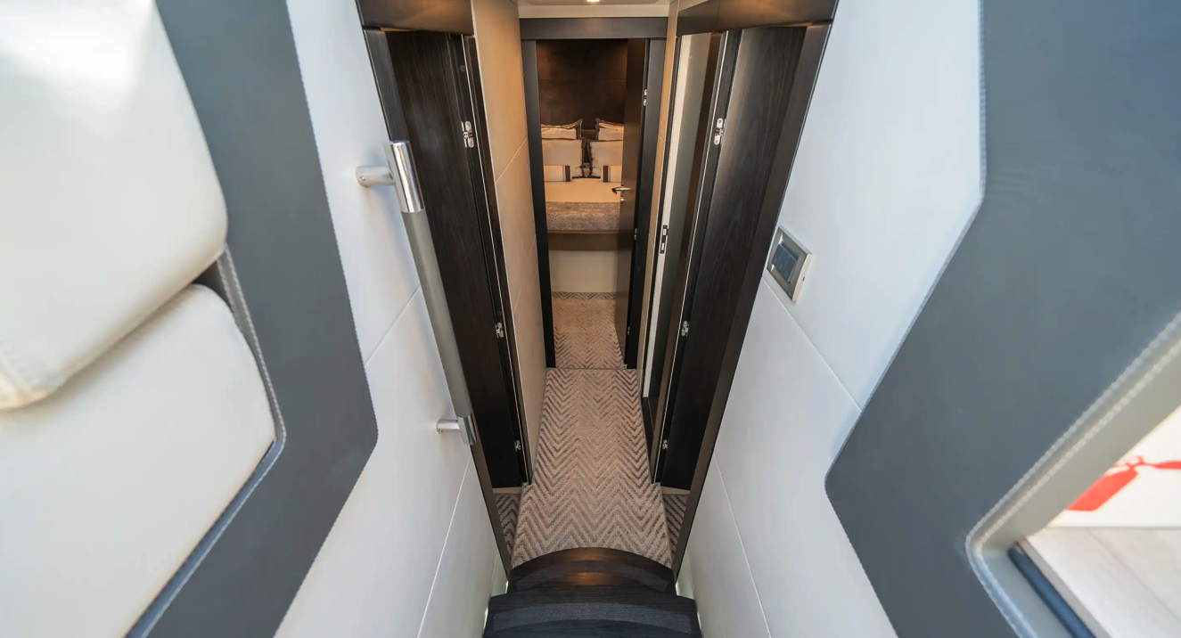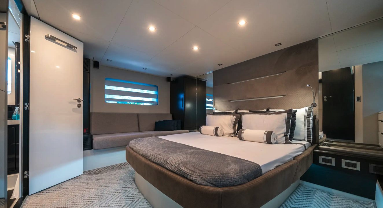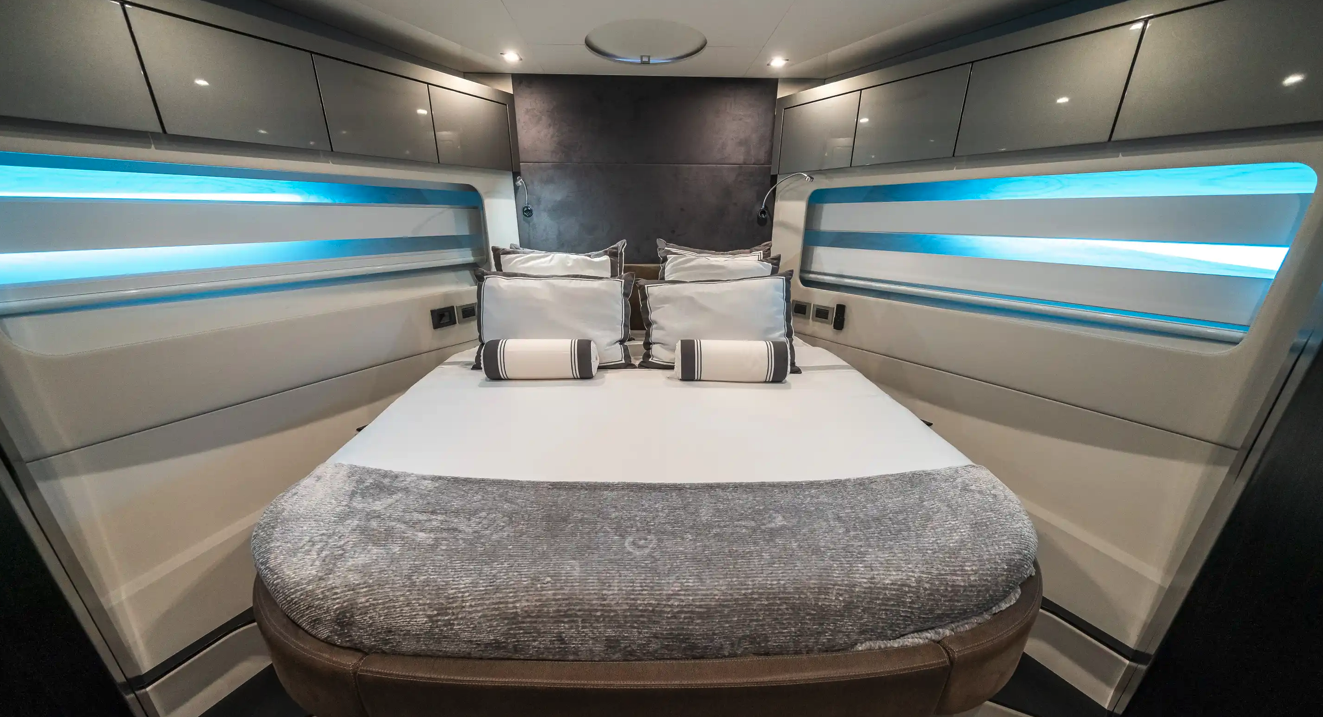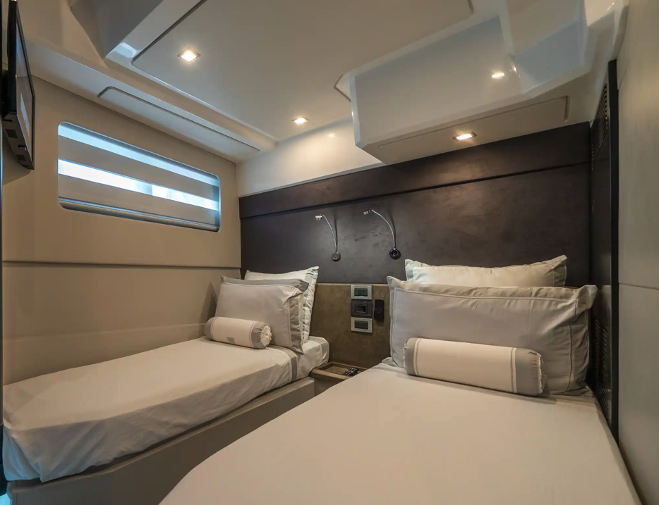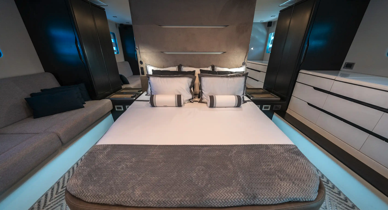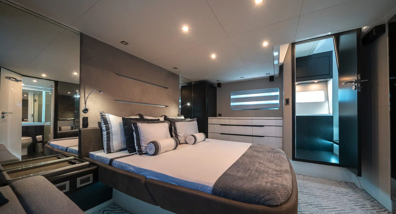 Equipped with a Garmin 17″ display at the lower helm and a stunning 21″ display at the upper helm for superior navigation. Marine radar (closed array) and third command station enhance control and safety, Hydraulic Swim Platform, Underwater Lighting, Premium teak decking on the flybridge and bow adds a touch of timeless luxury (side decks excluded). Flybridge Gourmet Station: Host effortlessly with a fully equipped gourmet station featuring a built-in grill and icemaker, perfect for entertaining, JL Audio Sound System: Enjoy crystal-clear sound throughout the yacht with a premium JL Audio upgrade. Smart TVs in every cabin, including the crew quarters, offers entertainment at your fingertips. Wine Cooler & Bar Insert: A double-size wine cooler and custom bar insert with bottle cutouts elevate the onboard experience. Seamless Comfort: Curtains in the heads and cabins provide added privacy and a cosy atmosphere. Monitoring System: A state-of-the-art monitoring system with four cameras ensures safety and control from anywhere on board. Seakeeper 9 Gyro Stabilizer: Experience unmatched stability and smooth cruising, even in rough waters.Watermaker: Enjoy extended stays at sea with the convenience of a built-in watermaker. Remote-Controlled Searchlight: Enhance visibility and safety with a remote-controlled searchlight for night navigation.