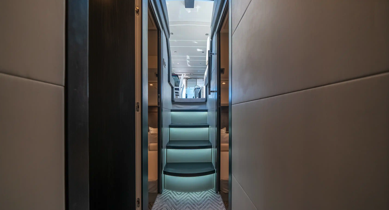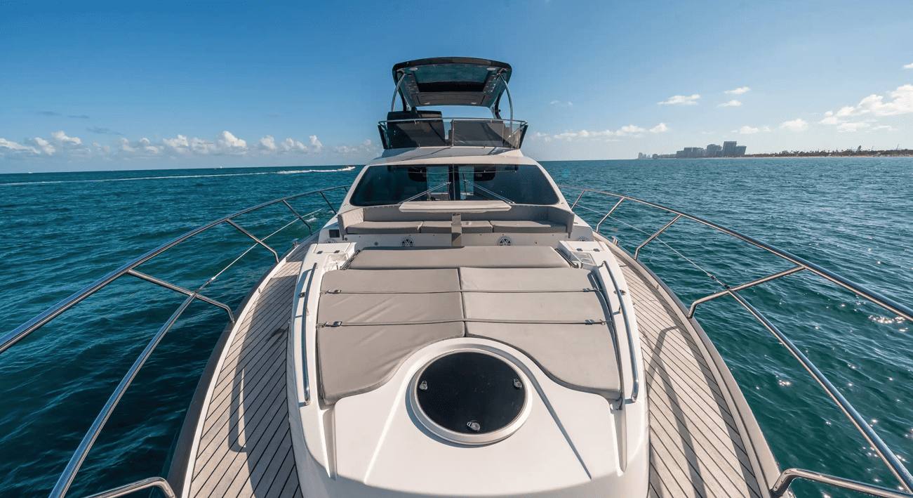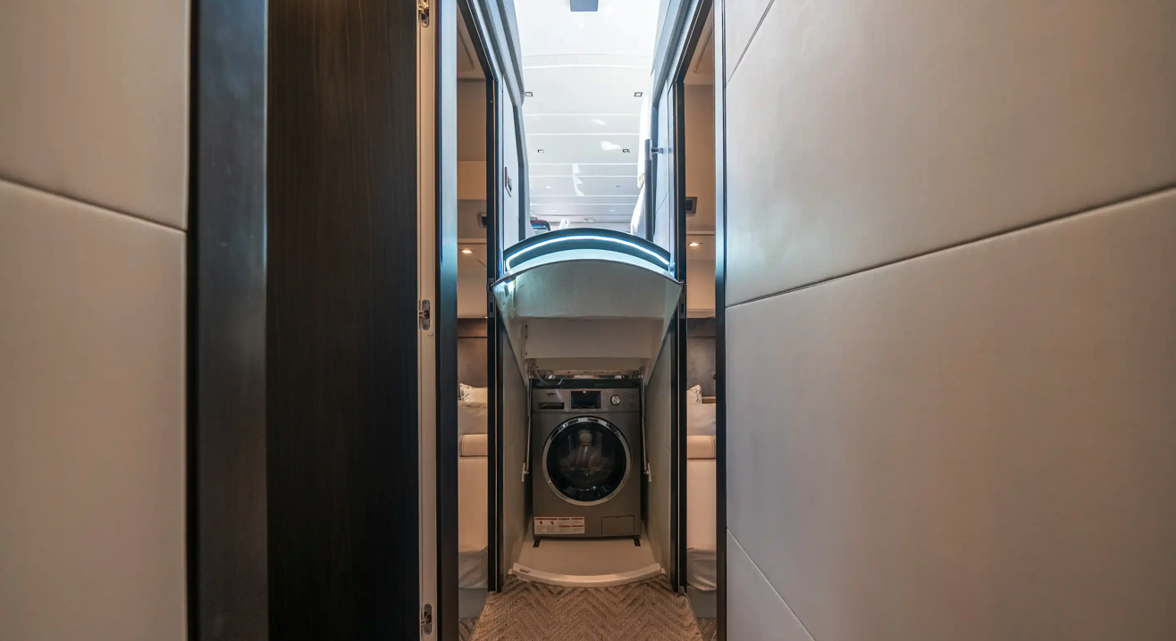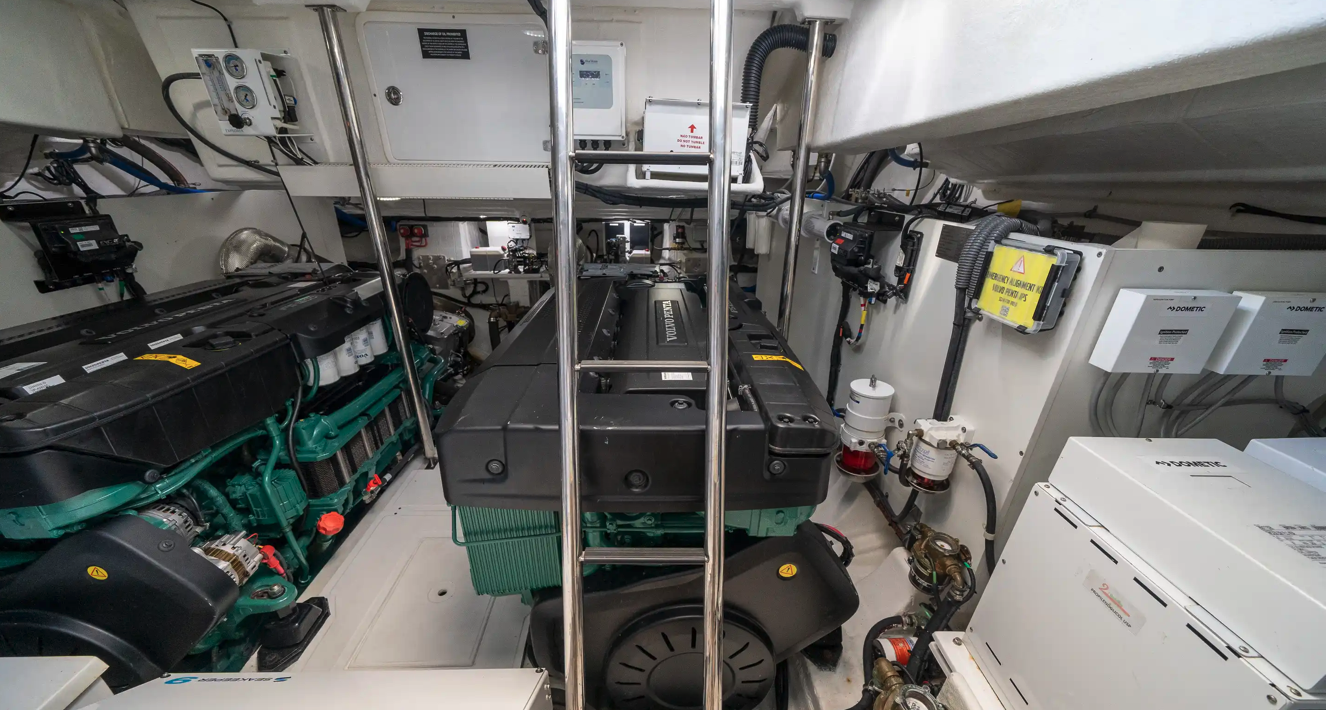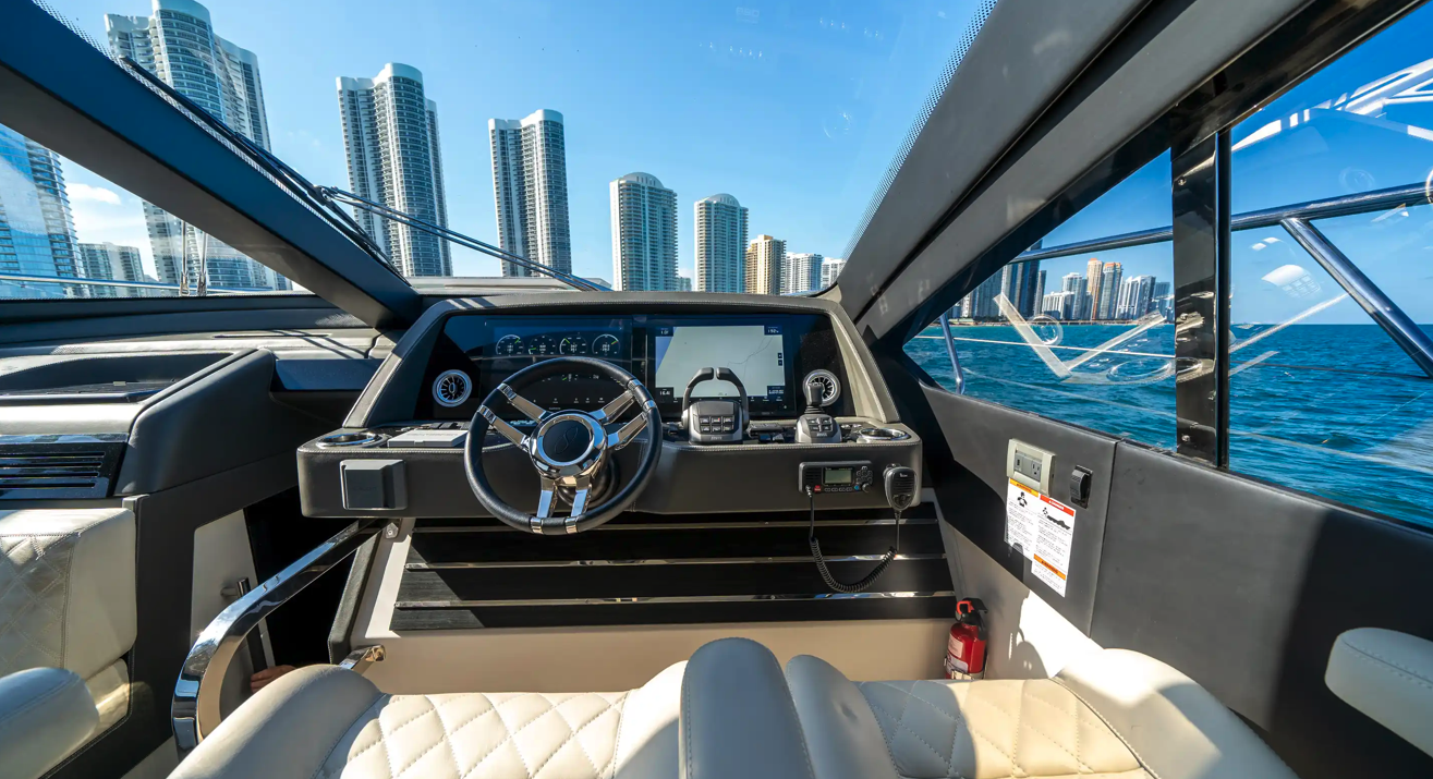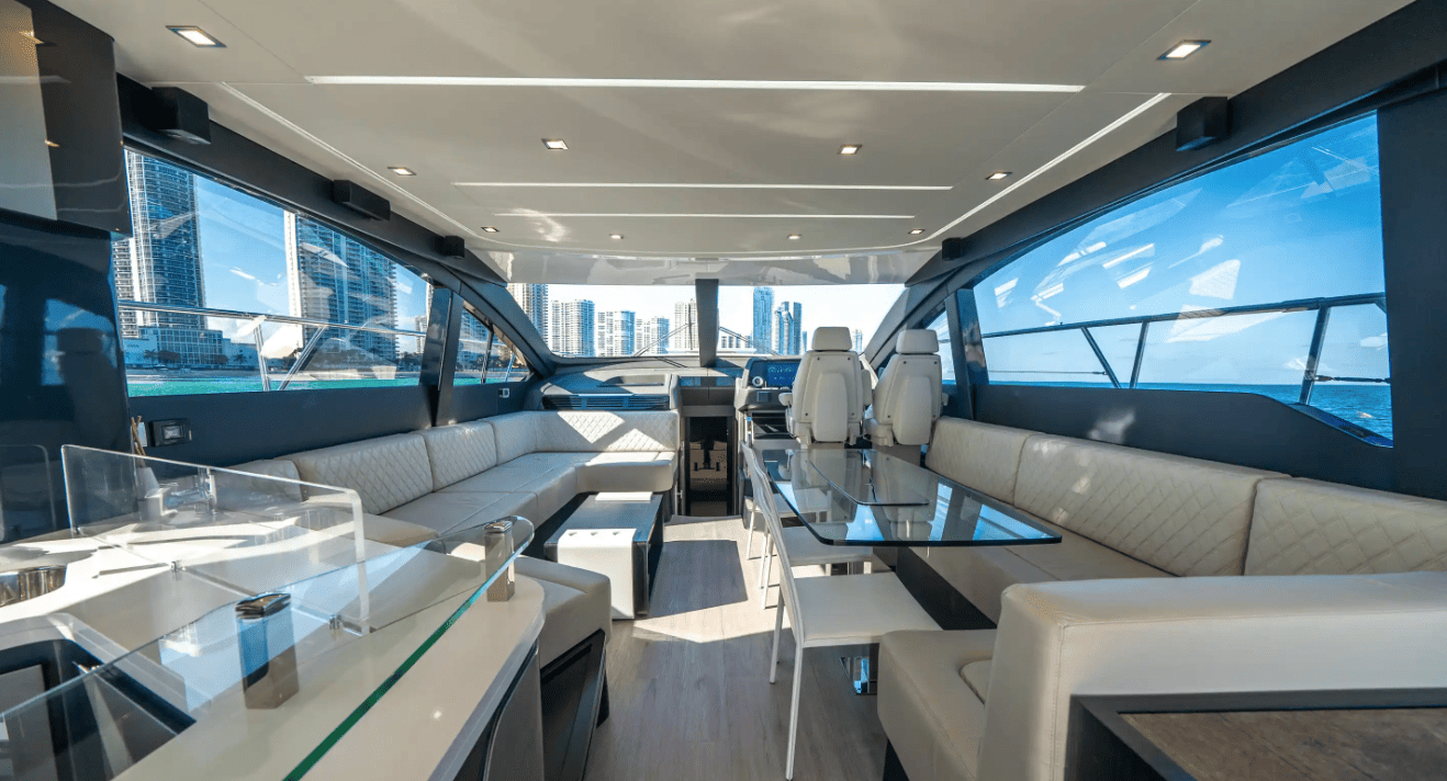 Equipped with a Garmin 17″ display at the lower helm and a stunning 21″ display at the upper helm for superior navigation. Marine radar (closed array) and third command station enhance control and safety, Hydraulic Swim Platform, Underwater Lighting, Premium teak decking on the flybridge and bow adds a touch of timeless luxury (side decks excluded). Flybridge Gourmet Station: Host effortlessly with a fully equipped gourmet station featuring a built-in grill and icemaker, perfect for entertaining, JL Audio Sound System: Enjoy crystal-clear sound throughout the yacht with a premium JL Audio upgrade. Smart TVs in every cabin, including the crew quarters, offers entertainment at your fingertips. Wine Cooler & Bar Insert: A double-size wine cooler and custom bar insert with bottle cutouts elevate the onboard experience. Seamless Comfort: Curtains in the heads and cabins provide added privacy and a cosy atmosphere. Monitoring System: A state-of-the-art monitoring system with four cameras ensures safety and control from anywhere on board. Seakeeper 9 Gyro Stabilizer: Experience unmatched stability and smooth cruising, even in rough waters.Watermaker: Enjoy extended stays at sea with the convenience of a built-in watermaker. Remote-Controlled Searchlight: Enhance visibility and safety with a remote-controlled searchlight for night navigation.