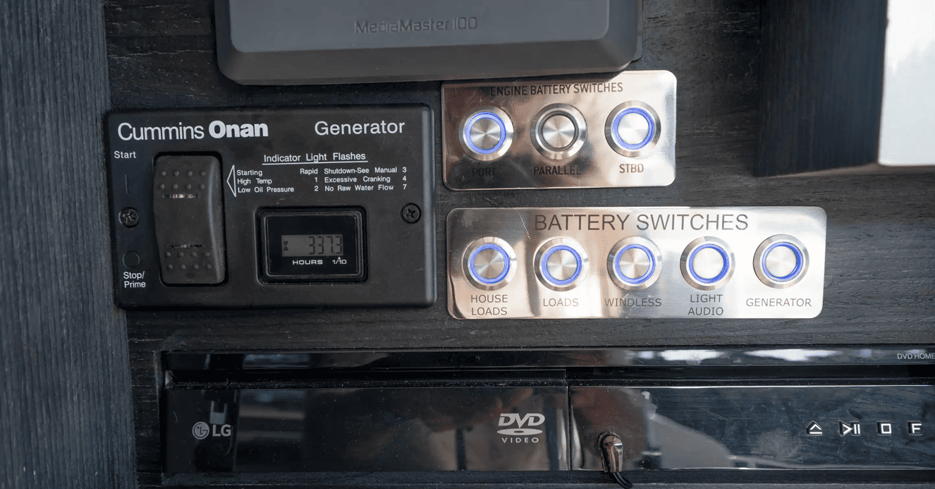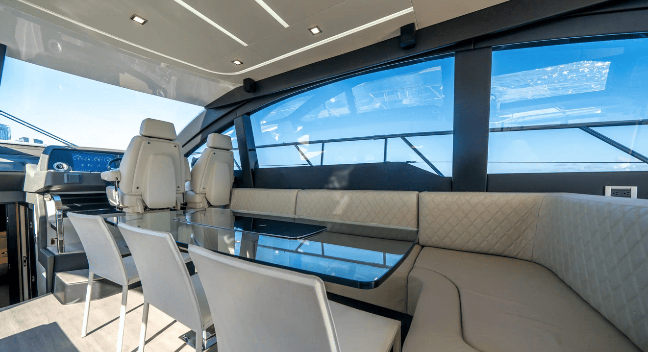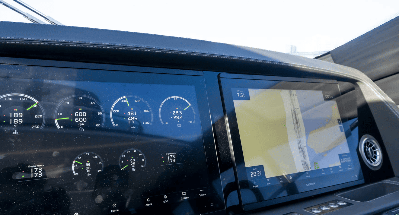 Above, the expansive flybridge is a standout feature, offering a lounge area, dining space, and a second summer kitchen complete with a grill. The flybridge helm station has state-of-the-art Garmin displays and Volvo Penta controls, ensuring smooth and precise navigation.