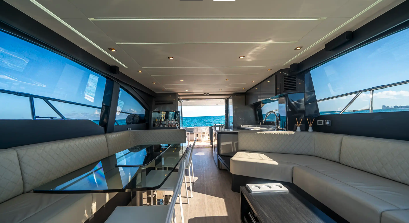 Step inside to discover seamless, single-level living from the cockpit to the salon, a hallmark of thoughtful design. The interior is adorned with high-quality finishes, rounded edges for added safety, and abundant storage throughout. The galley is fully equipped with a stand-up refrigerator and premium appliances, ensuring every culinary need is met. The salon exudes luxury with a plush couch, settee, wet bar, and wine fridge, creating an inviting space for relaxation.